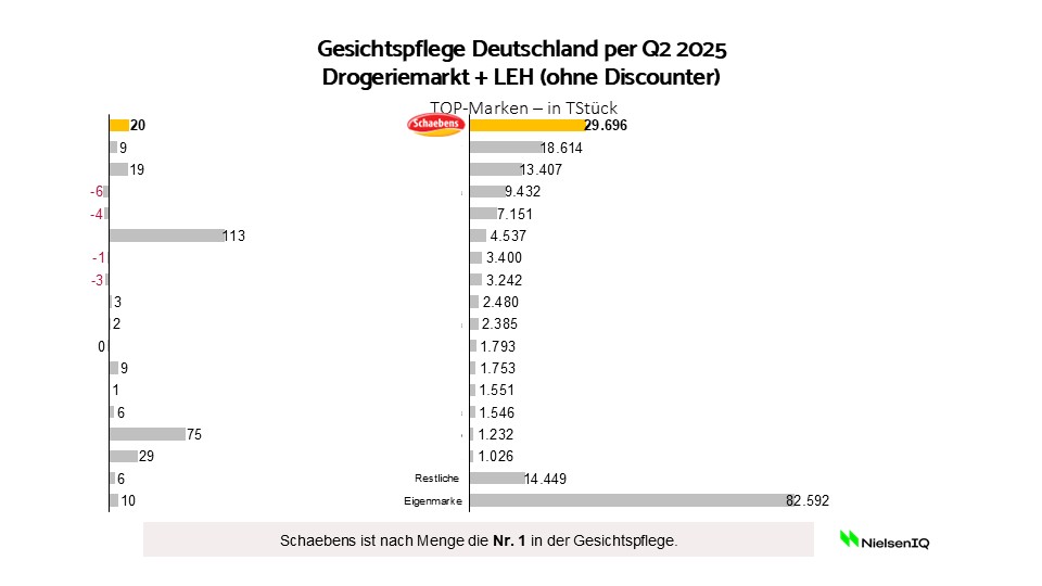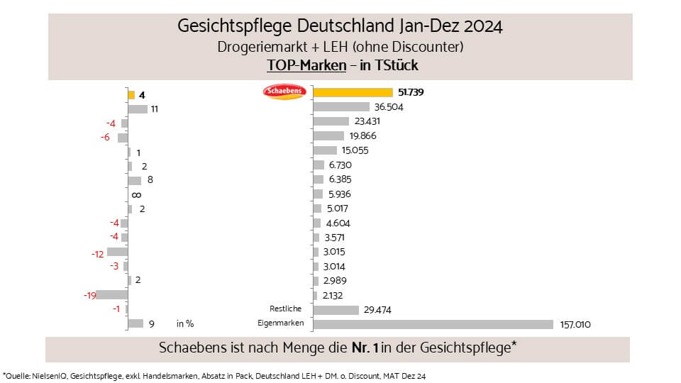 *1) gem. Marktforschungsinstitut NielsenIQ: Gesichtspflege, exkl. Handelsmarken, Absatz in Pack, Deutschland LEH + DM. o. Discount, seit 2015